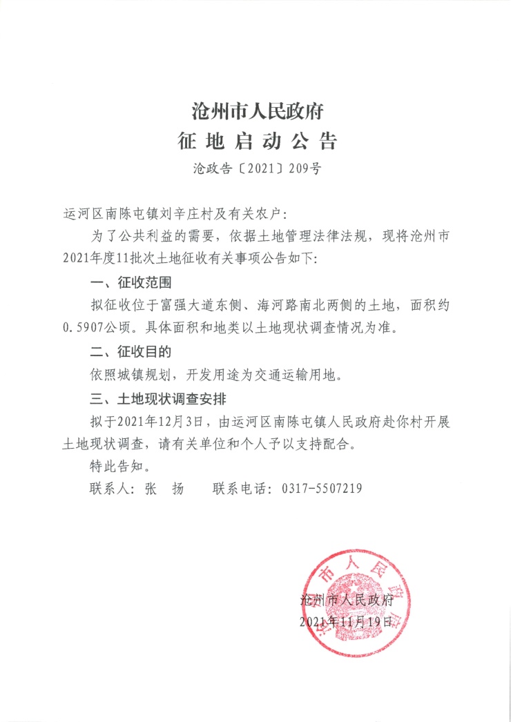 11月22日,沧州市自然资源和规划局发布多则征地启动公告。将征收运河区梁官屯村、大王庄村、刘辛庄村、小朱庄村、刘舒庄村、刘胖庄村、大王庄村土地共6.1214公顷(约91.82亩),开发用途为交通运输、公共管理与公共服务用地。