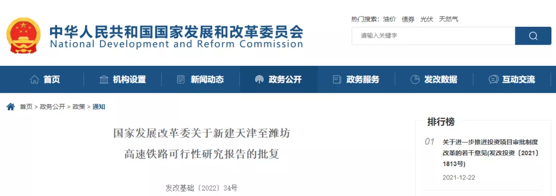 国家发展改革委较新发布关于新建天津至潍坊高速铁路可行性研究报告的批复,为加快构建京沪高速铁路辅助通道,完善区域铁路网络,促进沿线经济社会发展,同意新建天津至潍坊高速铁路(项目代码:2020-000052-53-01-008985)。