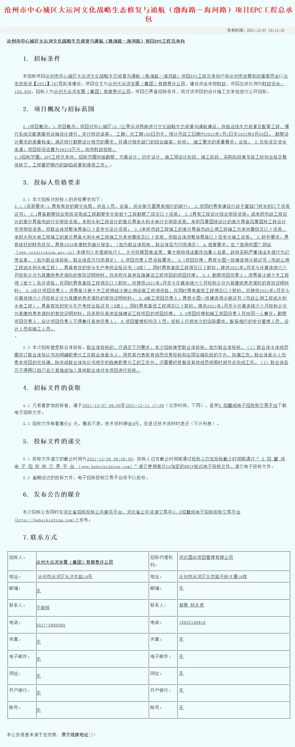 沧州市中心城区大运河文化战略生态修复与通航(渤海路-海河路)项目EPC工程总承包,已具备招标条件,现对该项目的设计施工总承包进行公开招标。