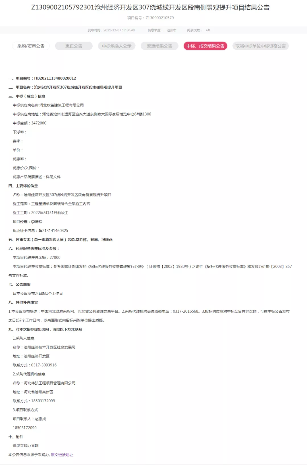 11月7日,沧州市行政审批局发布关于307绕城线开发区段南侧景观提升项目招标结果公告和中心城区大运河文化战略生态修复与通航(渤海路-海河路)项目EPC工程总承包招标公告。