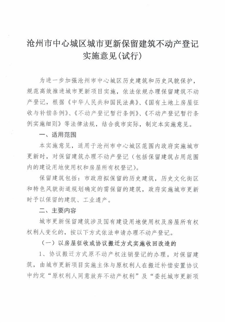 沧州市中心城区城市更新保留建筑不动产登记实施意见(试行)发布