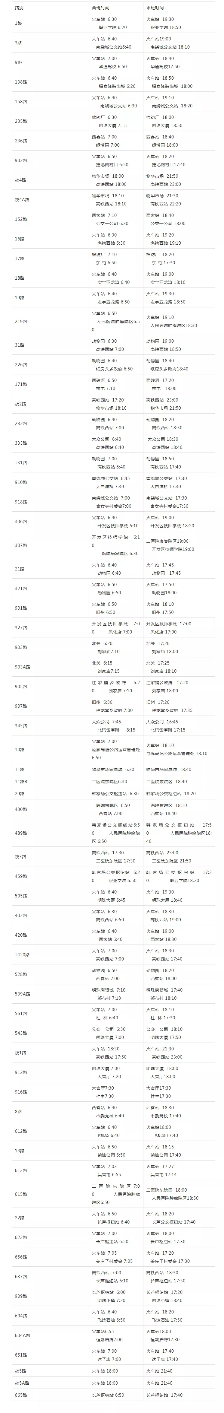 末班时间调整至19:30分的线路有1路(火车站19:30分 职院18:50分)、19路(火车站 19:30分亚龙湾18:50分)、505路(火车站19:30分 明珠大厦18:40分);末班时间调整至19:20分的线路有16路(火车站19:20分高铁西站19:10分);末班时间调整至19:10分的线路有158路(火车站19:10分 南绕城公交站18:20分)、219路(火车站19:10分 人民医院肿瘤院区18:30分);末班时间调整至19:00点的线路有3路(火车站19:00点人民医院颐和院区18:10分);31路(动物园 19:00点 高铁西站 18:50分)、18路(火车站 19:00点亚龙湾18:10分)、306路(火车站 19:00点 开发区技师学院18:20分)、307路(二医院康复院区19:00点 开发区技师学院19:00点)、402路(火车站18:30分 高铁西站19:00点)、420路(火车站 19:00点西客站 18:30分)。其他线路也做出了相应调整。